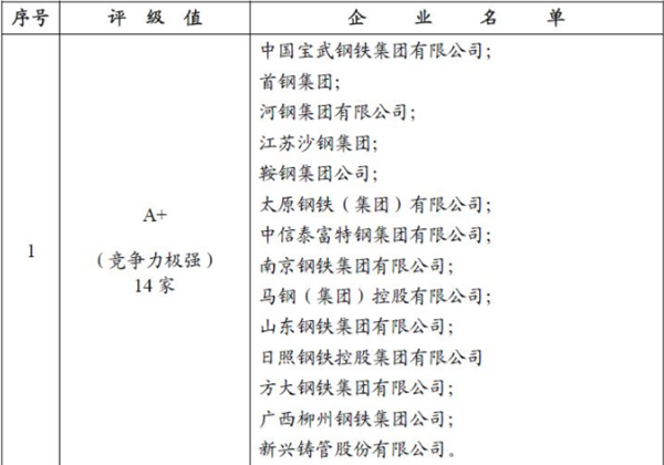 綜合比較108家鋼鐵企業(yè)的23項(xiàng)指標(biāo),結(jié)合專家研判,2018年中國鋼鐵企業(yè)綜合競爭力評(píng)級(jí)見表1(評(píng)級(jí)值相同的企業(yè),不分排名先后)。