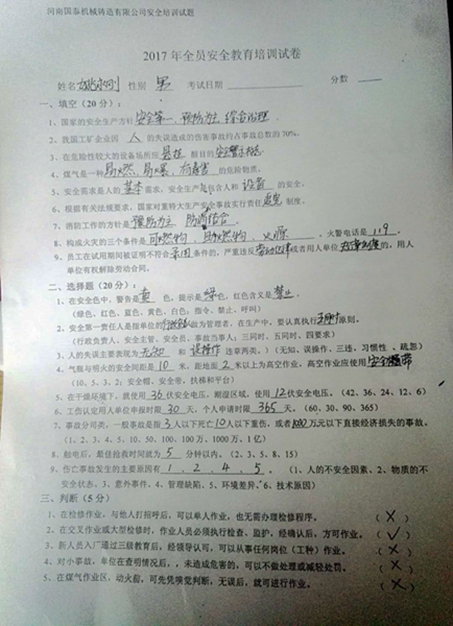 近日,公司生產(chǎn)運(yùn)營部組織全體員工進(jìn)行安全教育培訓(xùn),培訓(xùn)采用閉卷考試的方式,由員工統(tǒng)一填寫。