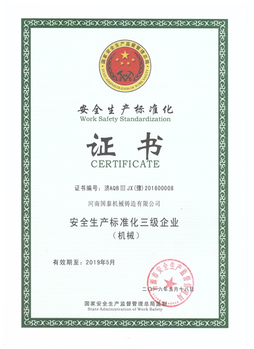 根據(jù)國家對企業(yè)安全標(biāo)準(zhǔn)化建設(shè)的要求,我公司于去年11月開始對已到期的安全標(biāo)準(zhǔn)化進(jìn)行復(fù)審工作。在經(jīng)過前期宣傳發(fā)動、對標(biāo)檢驗整改的基礎(chǔ)上,通過企業(yè)自評、中介機(jī)構(gòu)考評等程序以及市安監(jiān)局組織的專家評審驗收和公示后,我公司于2016年5月18日順利完成安全標(biāo)準(zhǔn)化三級復(fù)審取證工作,并取得相關(guān)證書。