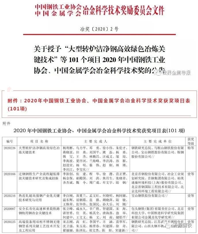 近日,中國(guó)鋼鐵工業(yè)協(xié)會(huì)、中國(guó)金屬學(xué)會(huì)發(fā)布《關(guān)于授予“大型轉(zhuǎn)爐潔凈鋼高效綠色冶煉關(guān)鍵技術(shù)”等101個(gè)項(xiàng)目2020年中國(guó)鋼鐵工業(yè)協(xié)會(huì)、中國(guó)金屬學(xué)會(huì)冶金科學(xué)技術(shù)獎(jiǎng)的公告》(下簡(jiǎn)稱:《公告》),《公告》稱,按照《中國(guó)鋼鐵工業(yè)協(xié)會(huì)、中國(guó)金屬學(xué)會(huì)冶金科學(xué)技術(shù)獎(jiǎng)獎(jiǎng)勵(lì)條例》及其《實(shí)施細(xì)則》規(guī)定,經(jīng)嚴(yán)格評(píng)審,冶金科學(xué)技術(shù)獎(jiǎng)獎(jiǎng)勵(lì)委員會(huì)決定對(duì)101個(gè)項(xiàng)目授予2020年中國(guó)鋼鐵工業(yè)協(xié)會(huì)、中國(guó)金屬學(xué)會(huì)冶金科學(xué)技術(shù)獎(jiǎng)。