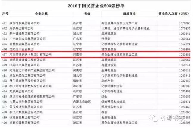 8月25日,全國工商聯(lián)發(fā)布“2016中國民營企業(yè)500強(qiáng)”榜單,濟(jì)源鋼鐵上榜,位居477位。
